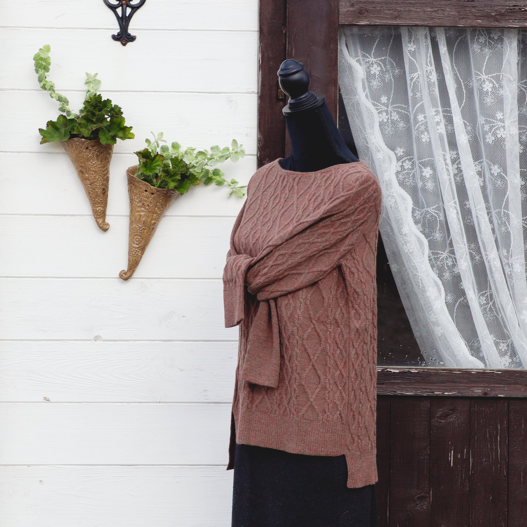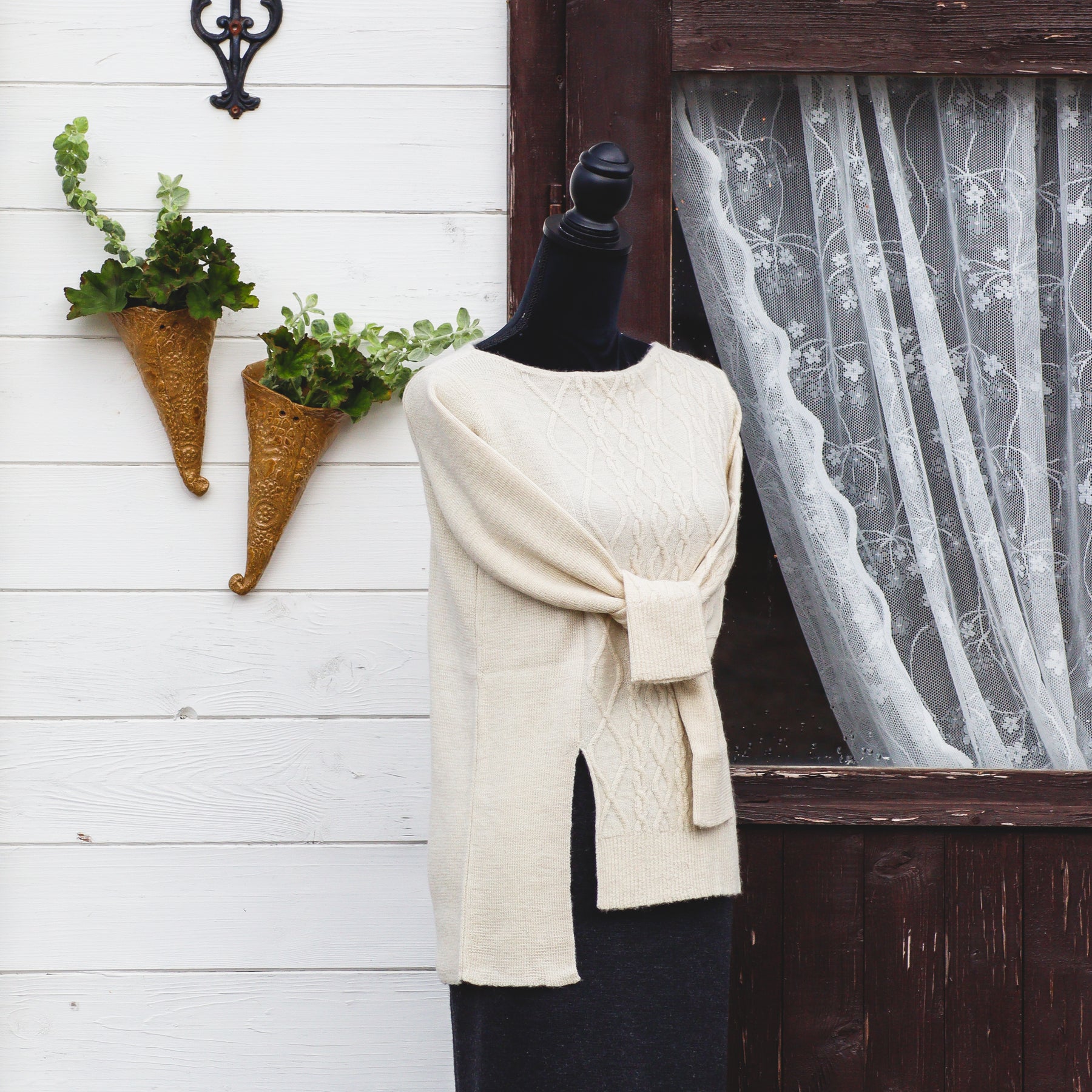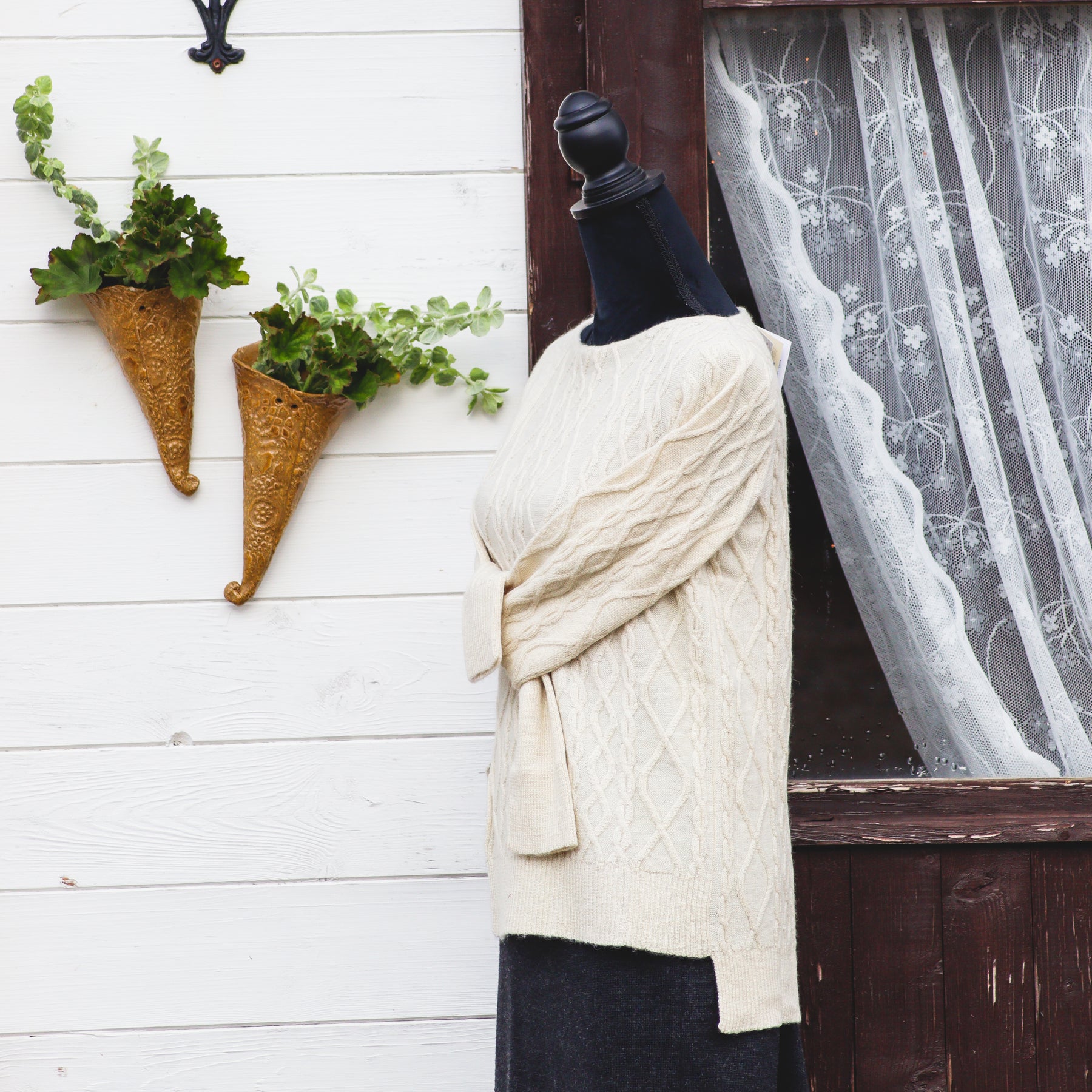 Skyltdockan bär storlek M (vit) och L (rost).