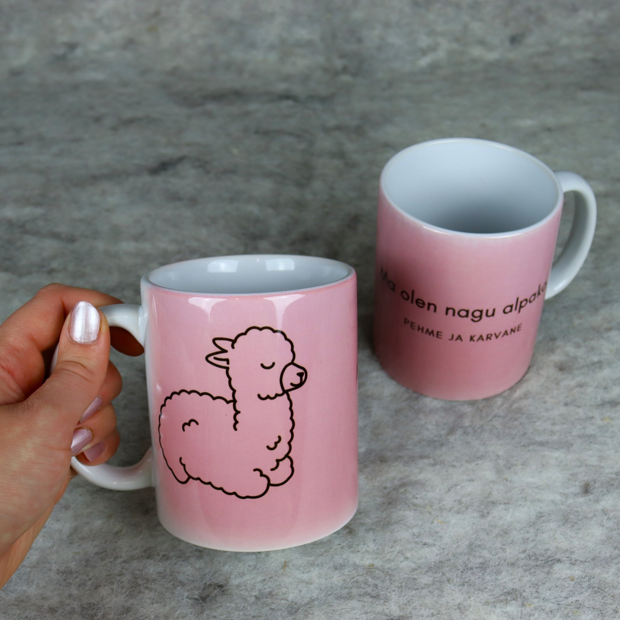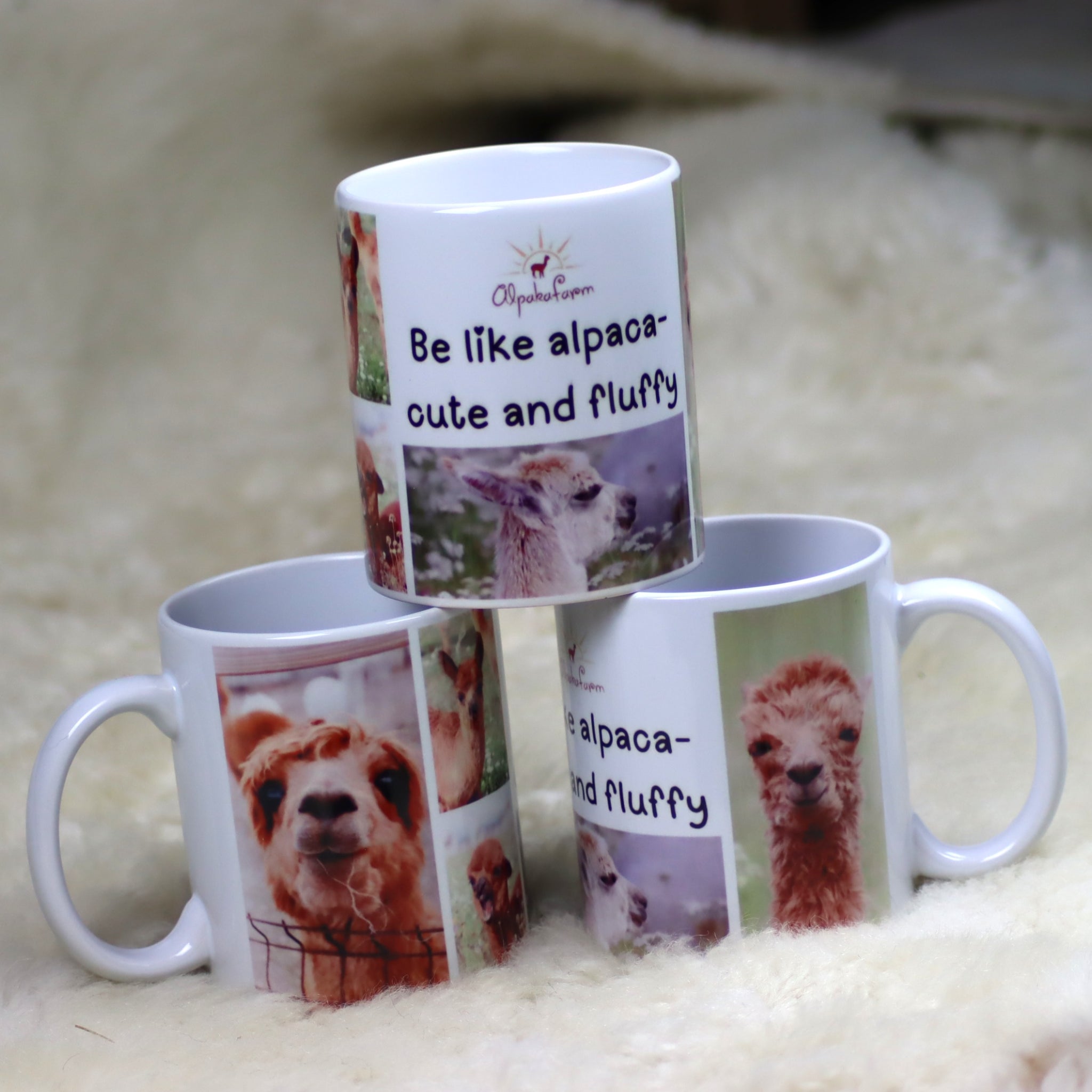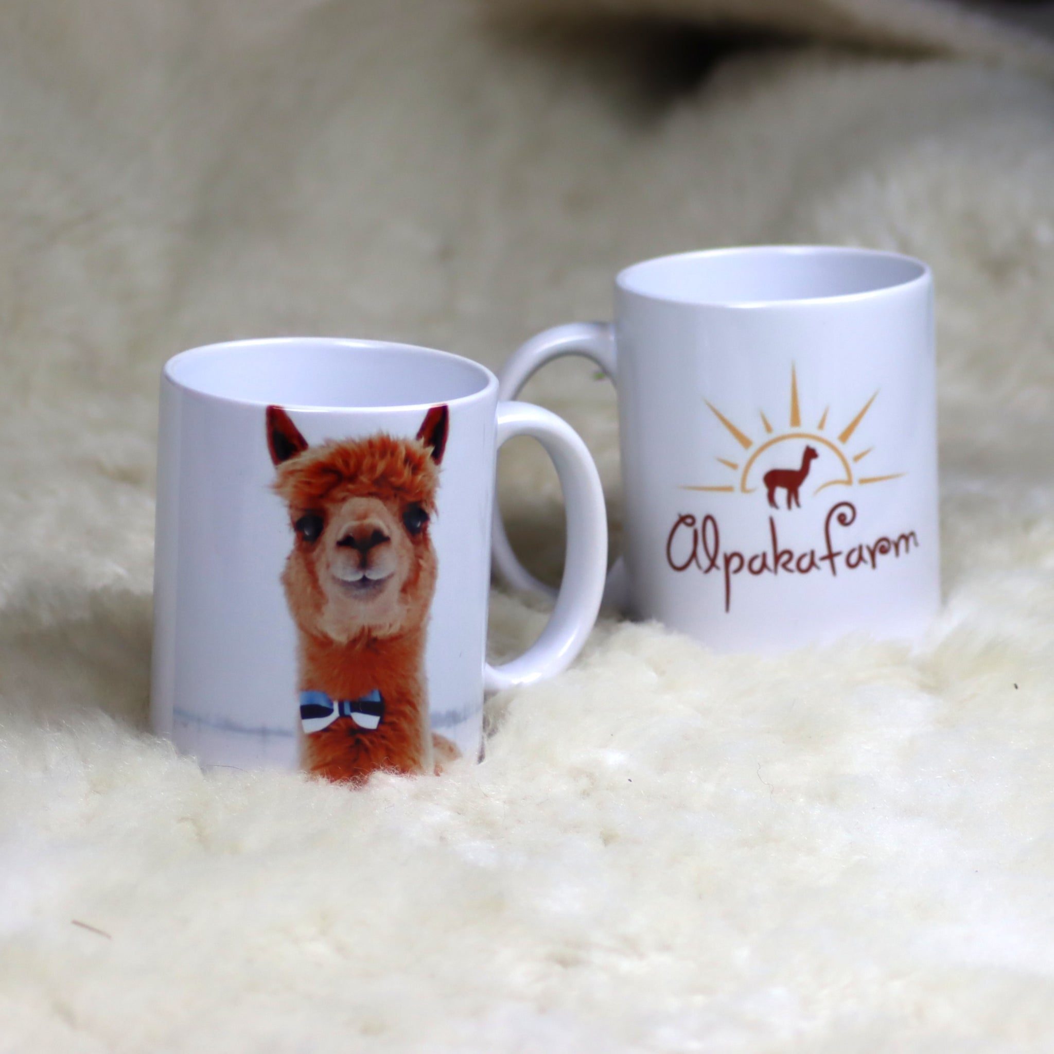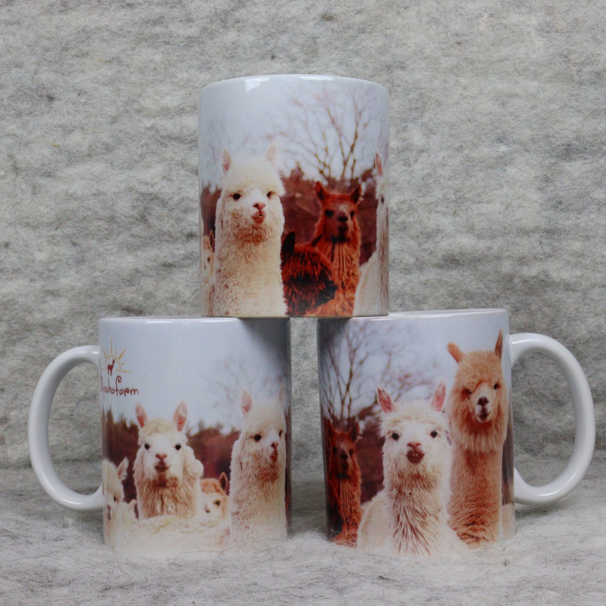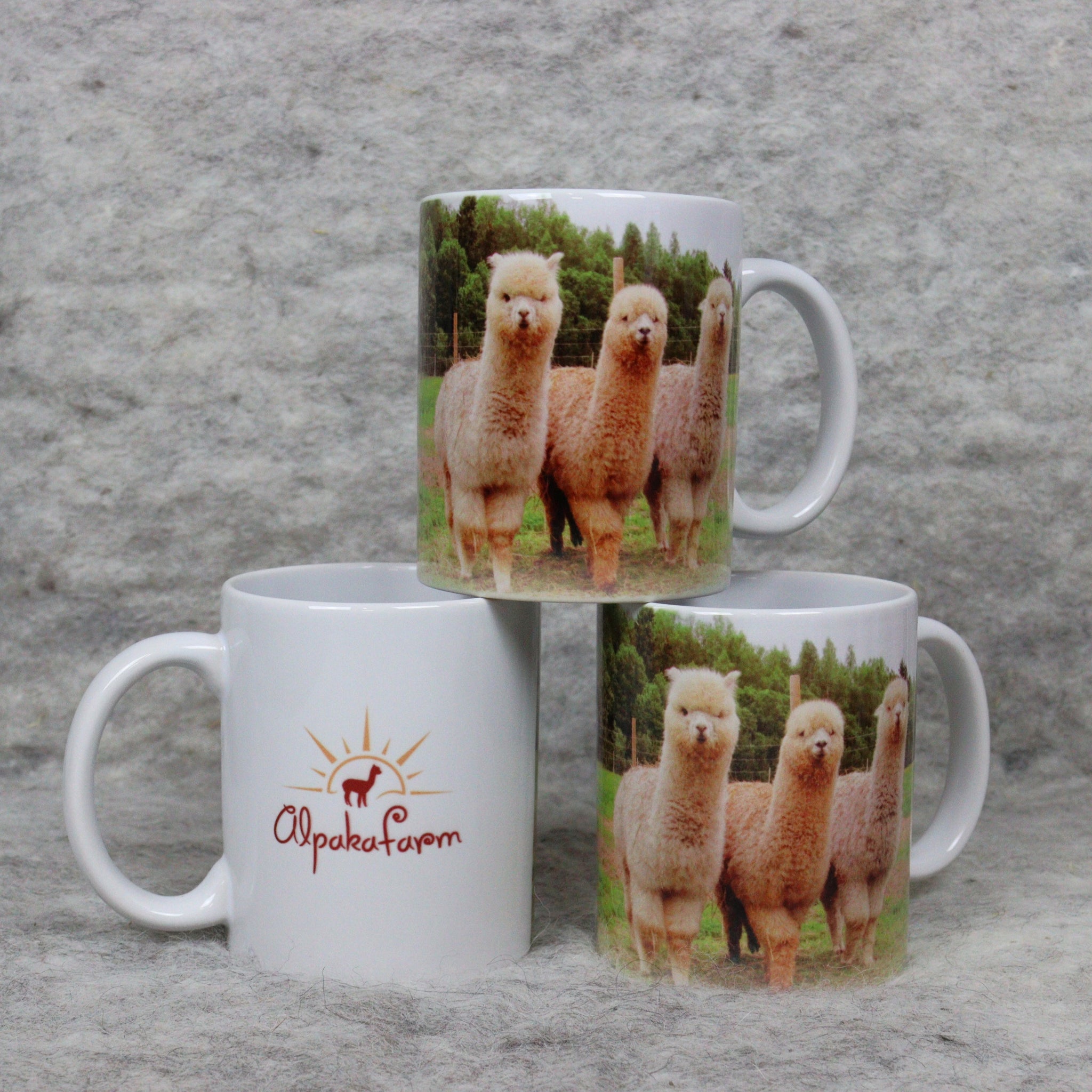 Olika koppar med bilder på Alpaca lantbruksdjur samt andra mönster.